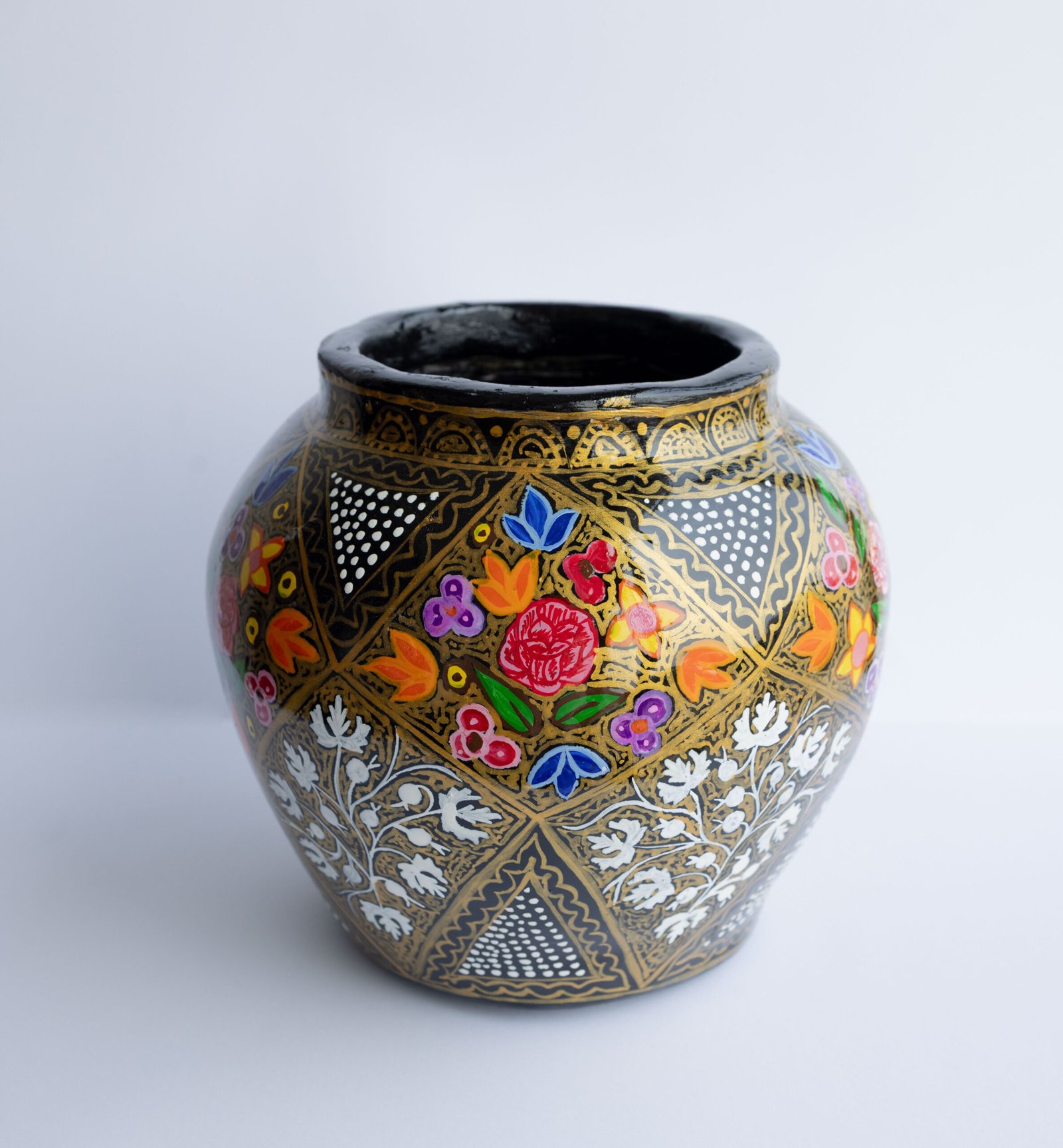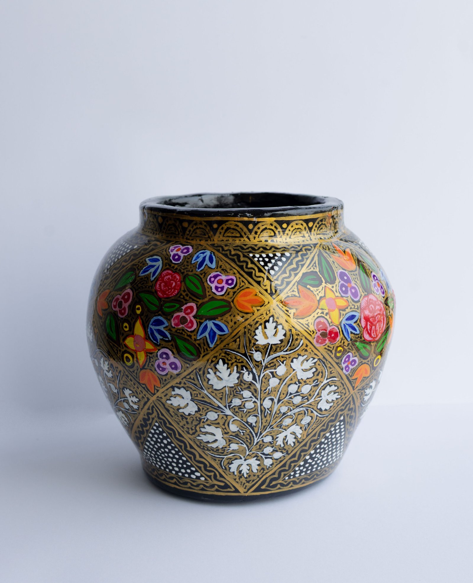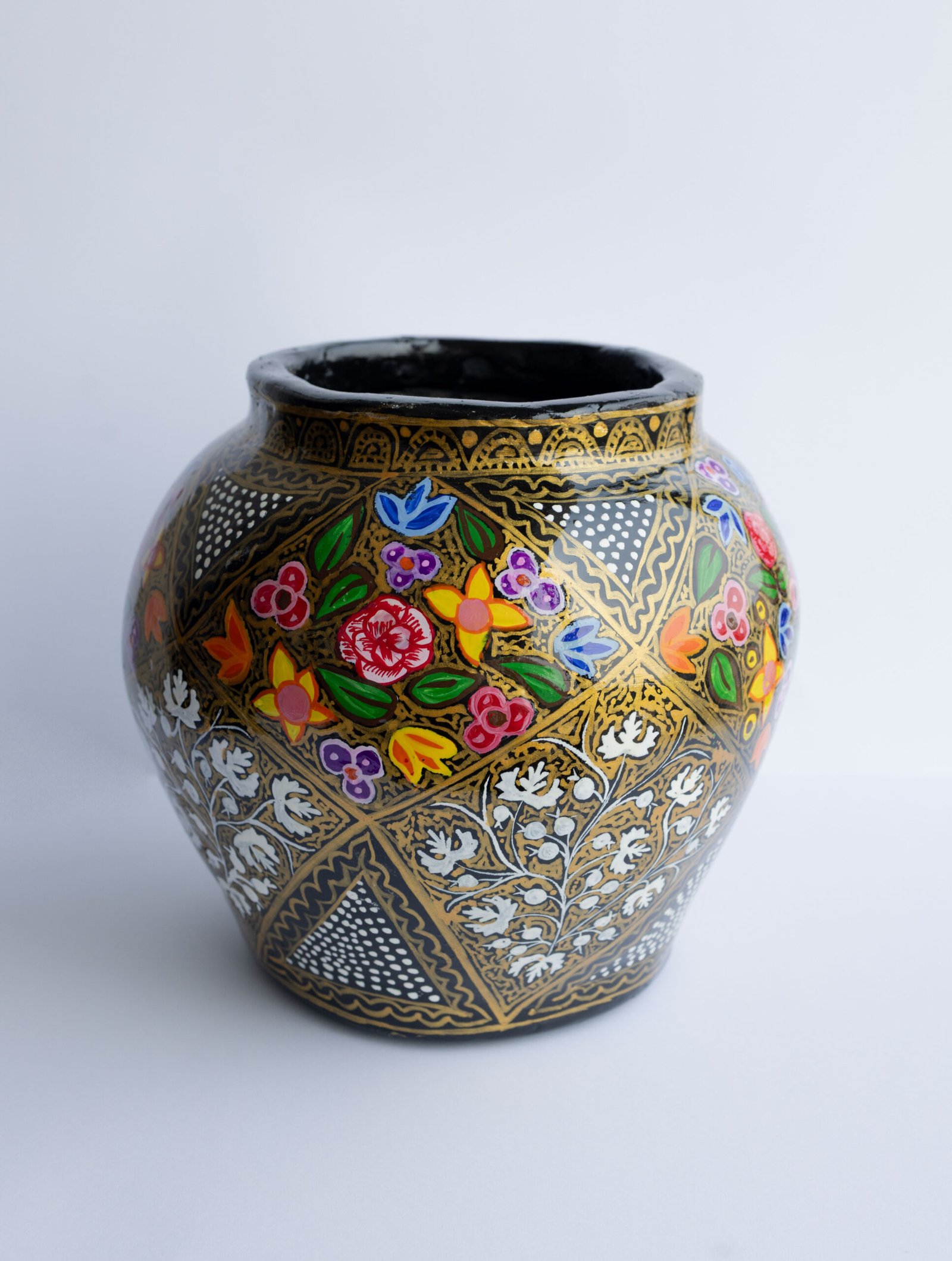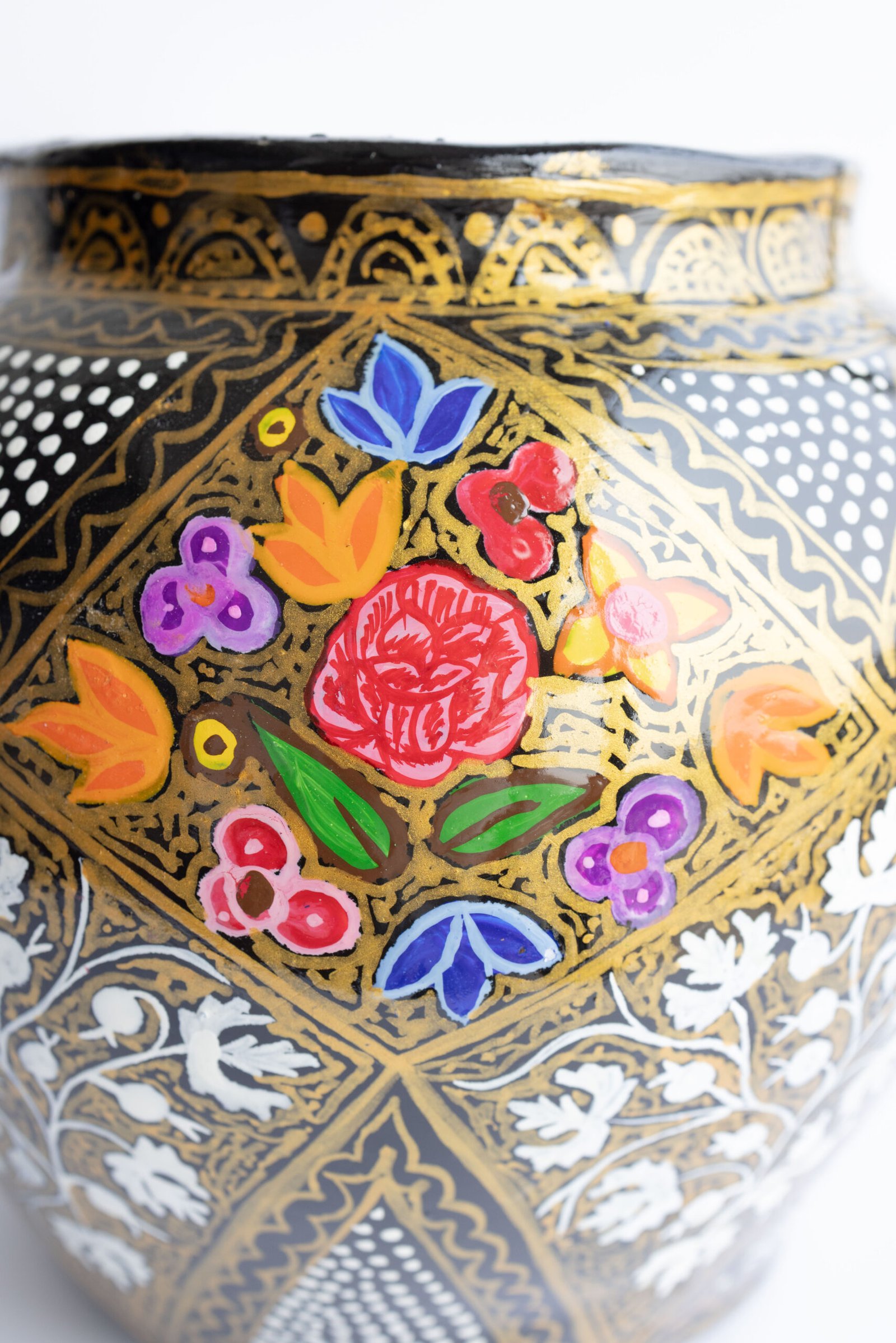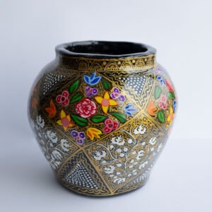 Transform your space with this stunning hand-painted Kashmiri papier-mâché vase. Crafted by skilled artisans using a centuries-old technique, this decorative piece features intricate, vibrant floral motifs and Chinar leaves set against a striking black and gold background.